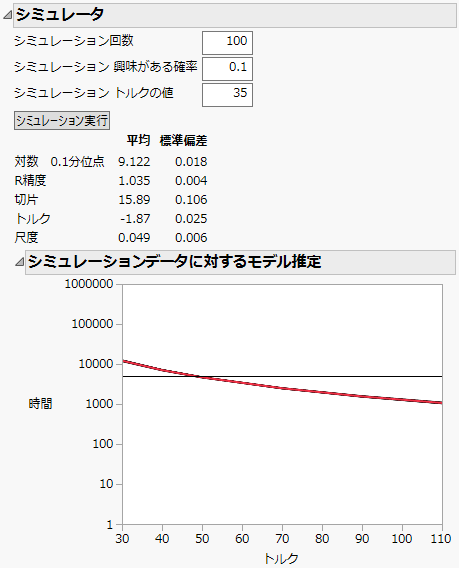 [シミュレーション実行]をクリックして実験の100回のシミュレーションを実行します。これにより、試験しようとしているユニット数(ここでは100)が十分かどうかを、計画で用いた事前の仮定に基づいて判断することができます。