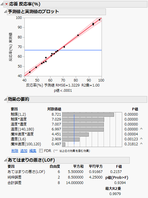 「予測値と実測値のプロット」から、モデルが全体として有意であることがわかります(p値<0.0001)。「予測値と実測値のプロット」と、「あてはまりの悪さ(LOF)」のどちらからも、モデルの間違いを示す証拠が見当たりません。「効果の要約」レポートによると、「触媒」が最も有意な効果であることがわかります。2因子間交互作用が3つとも有意になっていることにも注目しましょう。