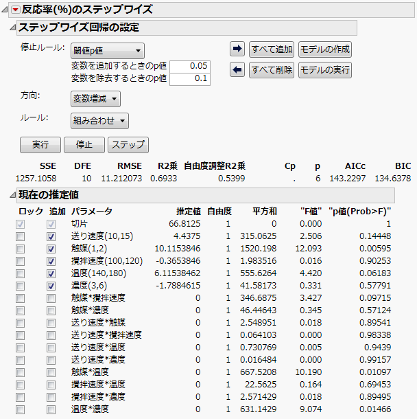 ステップワイズ回帰が主効果から始まり、p値を基準とした検索が行われ、その結果、4つの主効果と3つの交互作用の項が得られます。主効果の「送り速度」がモデルから除かれた一方で、「触媒*温度」、「攪拌速度*温度」、「温度*濃度」の交互作用がモデルに追加されています。