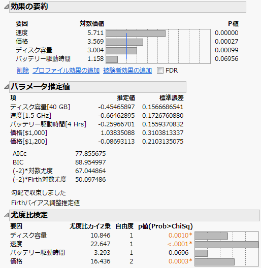 「価格」を$1,000から$1,500に変化させると、「効用」は–0.3406から–2.3303に変化します。つまり、ノートパソコンの価格を500ドル引き上げることで、効用(望ましさ)はおよそ2単位低くなります。したがって、効用1単位あたりの価格は、およそ250ドルであると推定できます。