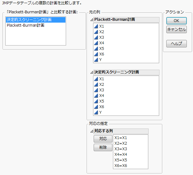 「Plackett-Burman計画」データテーブルで、[実験計画(DOE)]>[計画の診断]>[計画の比較]を選択します。
