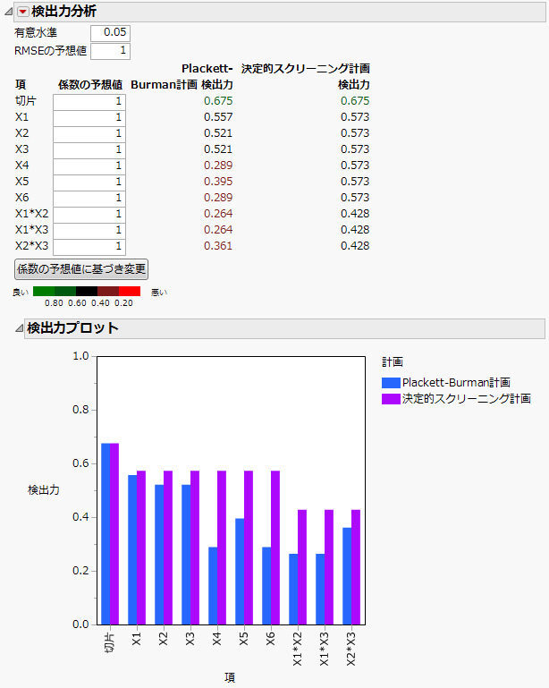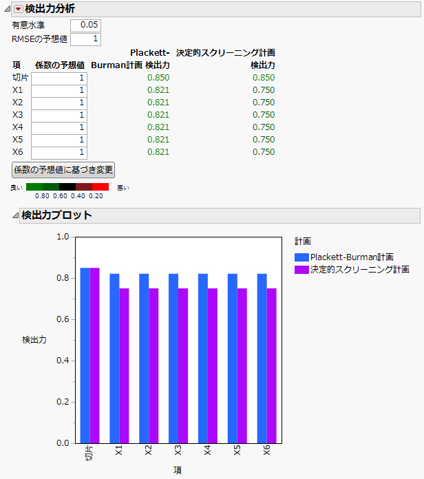 主効果だけを確認する実験では、検出力・予測分散・推定効率において、Plackett-Burman計画の方が決定的スクリーニング計画より優れています。Plackett-Burman計画と決定的スクリーニング計画における検出力分析の比較は、有意水準、RMSEの予想値、および係数の予想値をデフォルト値で設定したときの「検出力分析」レポートです。主効果だけの実験においては、Plackett-Burman計画は、決定的スクリーニング計画より検出力が高いことがわかります。