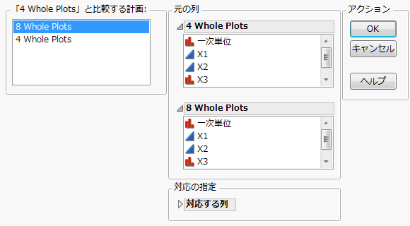 「基準の計画:「4 Whole Plots」(20実験)」アウトラインの「対応の指定」を開きます。