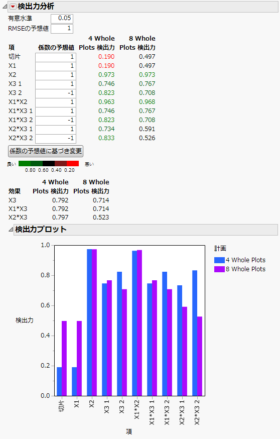 「検出力分析」レポートを見ると、一次単位に割り付ける因子X1の検出力は、一次単位4つの計画のほうが一次単位8つの計画より低いです(0.190と0.497)。しかし、二次単位に割り付ける因子、特にX2*X3の検出力は、一次単位4つの計画のほうが一次単位8つの計画より高いです(0.797と0.523)。X2*X3の検出力は、カラーバーと凡例の下に表示されています。