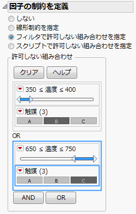 「因子の制約を定義」アウトラインで、[フィルタで許可しない組み合わせを指定]を選択します。
