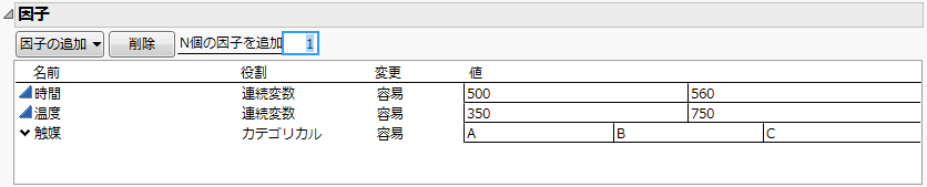 [因子の追加]>[カテゴリカル]>[3水準]を選択します。