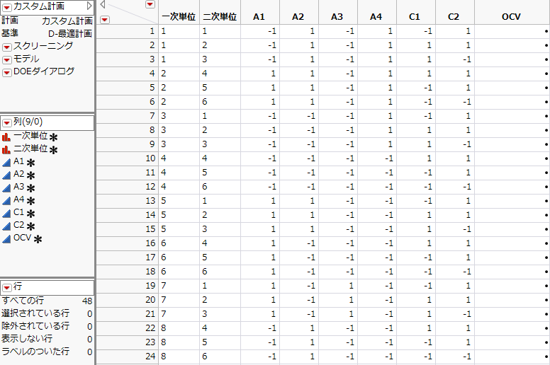 この実験では48個の実験ユニットを用います。また、第1段階の因子と、第2段階の因子の交互作用もモデルに含めます。