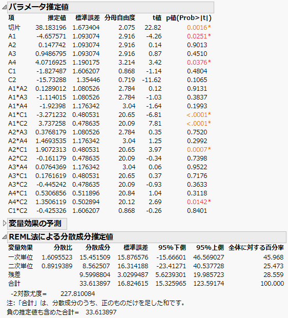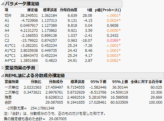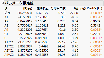 「パラメータ推定値」レポートから、4つの2因子間交互作用「A1*C1」、「A1*C2」、「A2*C1」、「A4*C2」と2つの主効果「A1」と「A4」が有意水準0.05において有意であることがわかります。