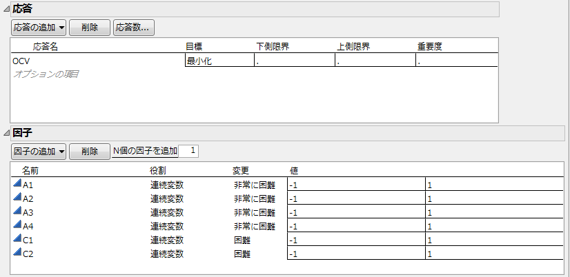 2方分割法においては因子を変更する難しさはどちらの段階でも同程度かもしれませんが、因子を区別するために、JMPでは第1段階の因子を「非常に困難」、第2段階の因子を「困難」と呼んでいます。また、第2段階の後で実験ユニットに追加する因子を、(変更が)「容易」と呼んでいます。