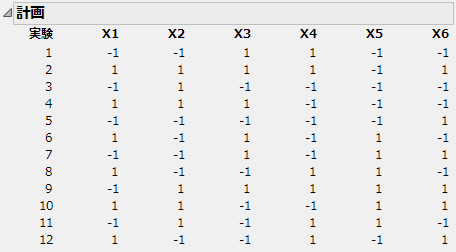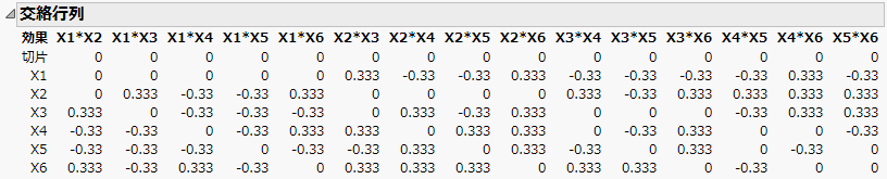 交絡行列(alias matrix)は、効果があるかもしれない2因子間交互作用が、主効果の推定値にどれほど影響を及ぼすかを示します。交絡行列の各列は、各交互作用に対応しています。たとえば、行「X1」では、「X2*X3」の列の値が「0.333」、「X2*X4」の列の値が「-0.33」になっています。これは、X1の主効果の推定値が受けるバイアス(偏り)が「(X2*X3に対する係数の0.333倍)+(X2*X4に対する係数の-0.33倍)+ …(以下、同じように)…」であることを意味しています。 この結果から、作成された実験計画においてX1の主効果の推定値が解釈できるようになるには、X1の効果に比べて交互作用が無視できるほど小さいと仮定できなければならないことが分かります。