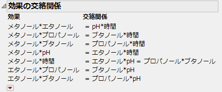 実験数16の一部実施要因計画の「効果の交絡関係」アウトラインは、すべての2因子間交互作用が、少なくとも1つの別の2因子間交互作用と交絡していることを示しています。この一部実施要因計画では、「メタノール*pH」が、「エタノール*時間」と完全交絡しています。このため、ある2因子間交互作用の影響を確認するには、実験を追加する必要があります。なお、「エタノール*時間」の交互作用は、因子を別の順序で指定すると、今回の例とは別の2因子間交互作用と交絡するようになります。