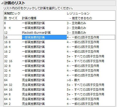 6つの連続変数に対するスクリーニング計画の一覧のように、実験回数16、ブロック因子なしの一部実施要因計画を選択します。
