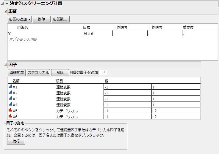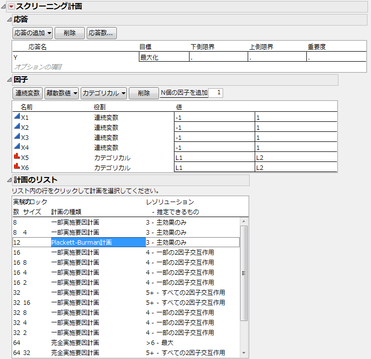 この例では、「計画の評価」プラットフォームを使って、決定的スクリーニング計画とPlackett-Burman計画を比較する方法を紹介します。「計画の比較」プラットフォームのさまざまな使用例については、「計画の比較」章の「同じ実験回数の計画」(449ページ)を参照してください。