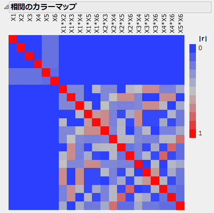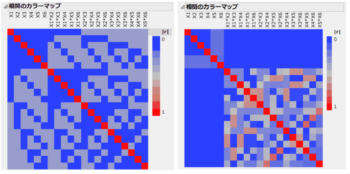 Plackett-Burman計画の相関(左)と決定的スクリーニング計画の相関(右)は、両方のカラーマップを表示していますが、Plackett-Burman計画のカラーマップは、主効果と2因子間交互作用を含む部分だけを示しています。(Plackett-Burman計画のカラーマップに3因子間交互作用を含めないようにするには、計画を作成してから、 [計画の評価]を使用してカラーマップを作成してください。)