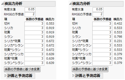 意図した計画(左)と実際の計画(右)の「検出力分析」アウトラインは、両ウィンドウの「検出力分析」アウトラインです。「計画と予測応答」アウトラインは閉じています。