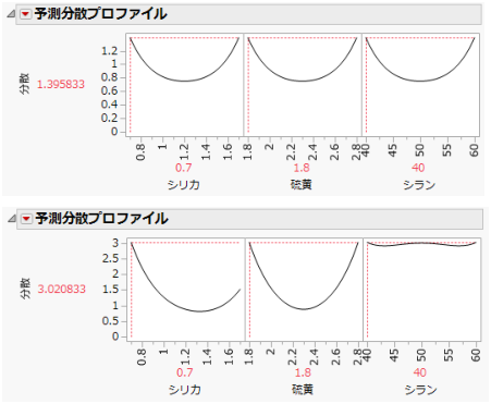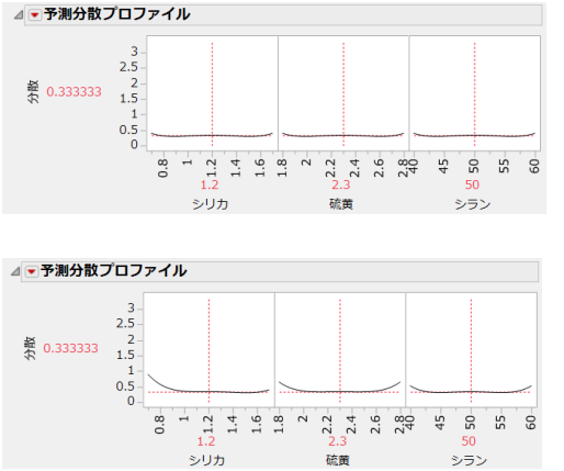 どちらの計画も、「シリカ」 =0.7、「硫黄」 =1.8、「シラン」 =40の計画点で予測分散が最大になっています。意図した計画では、予測分散の最大値は1.396でした。しかし実験の少ない実際の計画では、予測分散の最大値は3.021にもなります。予測分散が最大になる点は、他にもあることに注意してください。実際の計画の方が最大予測分散が大きいのは、計画領域の一部における予測の精度が、意図した通りに計画を実施した場合より低いことを意味します。