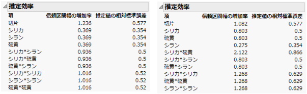 「信頼区間幅の増加率」は、現在の計画から計算される信頼区間の幅を、実験回数が同じ理想的な計画から計算される信頼区間の幅と比較します。信頼区間の幅は、実験回数に左右されます(その結果、「信頼区間幅の増加率」も実験回数に左右されます)。第 “信頼区間幅の増加率”を参照してください。今回の例における実際の計画では、意図した計画の値よりも、実験回数が減っているにも関わらず、「シラン」、「シリカ*シラン」、「硫黄*シラン」での増加率が小さくなっています。これは、実際の計画において除外された2つの実験が、「シラン」の中心点で行われているためです。それら2つの実験を除外することで、パラメータの信頼区間幅が中心点のない理想的な直交計画のものに近づき、増加率が小さくなっているのです。