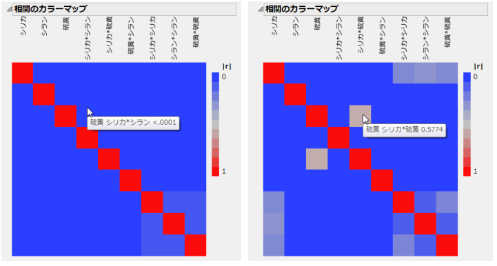 相関係数の絶対値は、0(青)から1(赤)の値を取ります。セルの上にポインタを置くと、相関係数の絶対値を確認できます。相関係数の絶対値は、実際の計画におけるカラーマップを見ると、意図した計画のそれより大きくなっています。たとえば、「硫黄」と「シリカ*硫黄」間の相関は、意図した計画では0.0001より小さいですが、実際の計画では0.5774になっています。