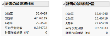 計画の効率は、実験回数とモデル行列の両方によって決まります。ある計画のD効率、G効率、A効率は、同じ実験回数での理想的な計画と比較して求められます。実験回数が多い計画のほうが、少ない計画に比べて常にこれらの効率が良いわけではありません。ただし、因子数が同じ場合には、実験回数が多いほうが平均予測分散は小さくなる傾向にあります。効率の定義については、第 “計画の診断統計量”を参照してください。