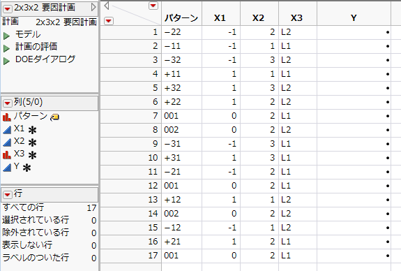 [テーブルの作成]をクリックすると、実験計画をまとめたデータテーブルが作成されます。計画データテーブルは、5つの中心点を含む3因子の完全実施要因計画の例です。3つの因子は、X1(2水準の連続変数)、X2(3水準の連続変数)、およびX3(2水準のカテゴリカル変数)です。因子の水準は、デフォルト値を使用しています。7、8、12、14、17行目が、中心点に該当します。第 “「パターン」列”を参照してください。