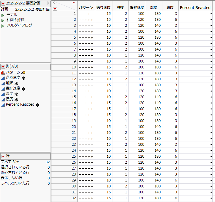 計画のデータテーブルにおける最初の列には、各実験における因子の水準の組み合わせが、+記号(高い値)と-記号(低い値)で示されます。テーブルには、実験を行った後に応答値を入力するための「Percent Reacted」という空白の列も用意されています。