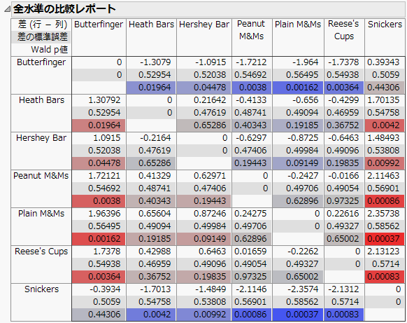 比較レポートを見ると、効用値の差が大きいキャンディの組み合わせがわかります。各セルの3つ目の項目は、行の項目の効用値から列の項目の効用値を差し引いた差に対するp値です。p値の色の濃度は、効用値の差の大きさを示します。青または赤の陰影は、効用値の差(行の効用値から列の効用値を差し引いた値)が、負であるか正であるかを表します。これらのp値は多重調整されておらず、多重比較の過誤率は制御されていません。これらのp値は、参考にするぐらいで用いてください。「全水準の比較レポート」の詳細については、『消費者調査』の「プロファイル」章を参照してください。