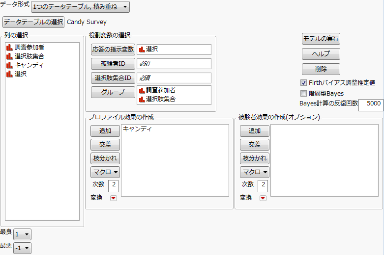 作成された計画のデータテーブルには、回答者の好みを記録するための「選択」列があります。選択肢集合ごとに、最も好きなキャンディに「1」、最も嫌いなキャンディに「-1」、それら以外の2つのキャンディには「0」と記録してください。