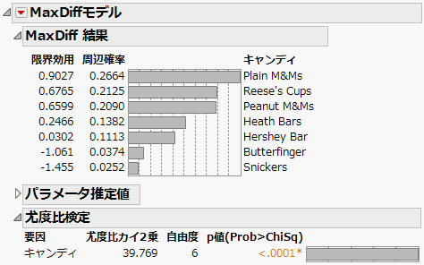 このレポートは、「キャンディ」の違いによる効果が有意であることを示しています。高い効用値を持つ上位3位のキャンディは、Plain M&Ms、Reese’s Cups、Peanut M&Msです。