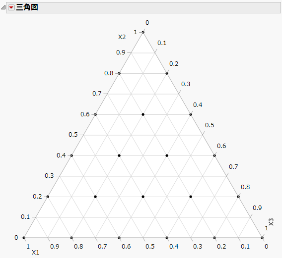 単体格子計画は、実験点を三角形のグリッド上に均等に配置した計画です。順に i / mの値を因子に割り当てる方法です。mを水準数、iを0~mの数値とし、すべての因子の合計を1とします。たとえば、水準数mを3に指定した計画では、因子の水準が0、0.333、0.667、1に設定されます。