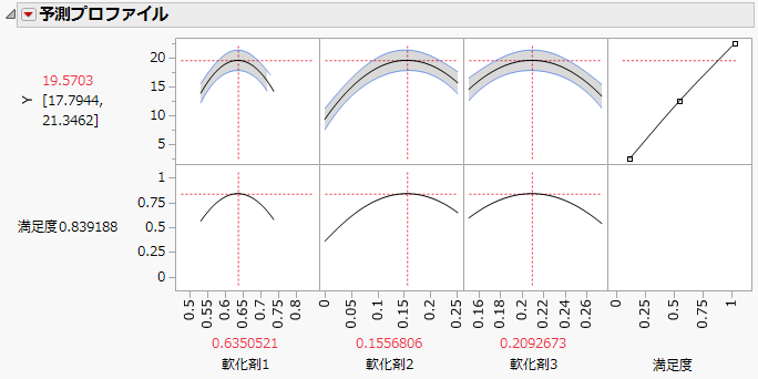 満足度を最大化した後の予測プロファイルを見ると、「軟化剤1」が0.6350、「軟化剤2」が0.1557、「軟化剤3」が0.2093で、それに対する応答の予測値は19.5703になっています(配合計画の予測プロファイルで満足度を最大化したところ)。