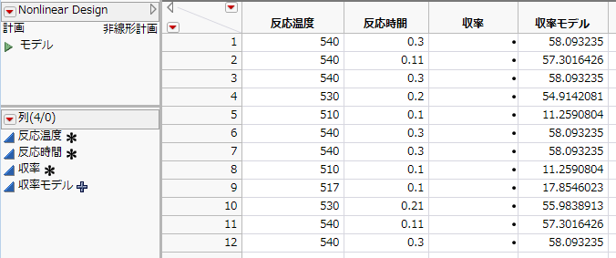 計画のデータテーブルのような計画が作成されます。実験の順序、「反応温度」と「反応時間」の値、および「収率モデル」の計算値に関して、実際の結果はここで示しているものとは異なったものになります。「収率モデル」には計算式が含まれているため、その計算値がこの列に表示されます。また、データテーブルには、「モデル」スクリプトが含まれていて、これを使って、観測値に非線形モデルをあてはめることができます。