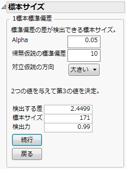 あるシリコンウエハーのロットにおける抵抗率の分散は、公称値が100Ω平方cmです。ある顧客は、納品されるロットの分散を155Ω平方cm以下に抑えることを要求しています。55Ω平方cmだけずれたときに、目標値である100Ω平方cmに対する検定が高い確率で有意になるには、何個のウエハーをテストしなければならないでしょうか。仮説の標準偏差(σ0)は10(100の平方根)、対立仮説での標準偏差は12.4499(100 + 55 = 155の平方根)です。つまり、「検出する差」は12.4499 - 10 = 2.4499です。検出力は0.99、有意水準は0.05とします。