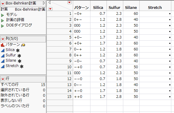 この例では、操作を省くために、データテーブルに保存されている応答と因子の設定をロードします。計画を最初に設定するときには、ここでの説明のようにデータテーブルからロードするのではなく、応答と因子の情報を入力する必要があります。第 “応答”および第 “因子”を参照してください。