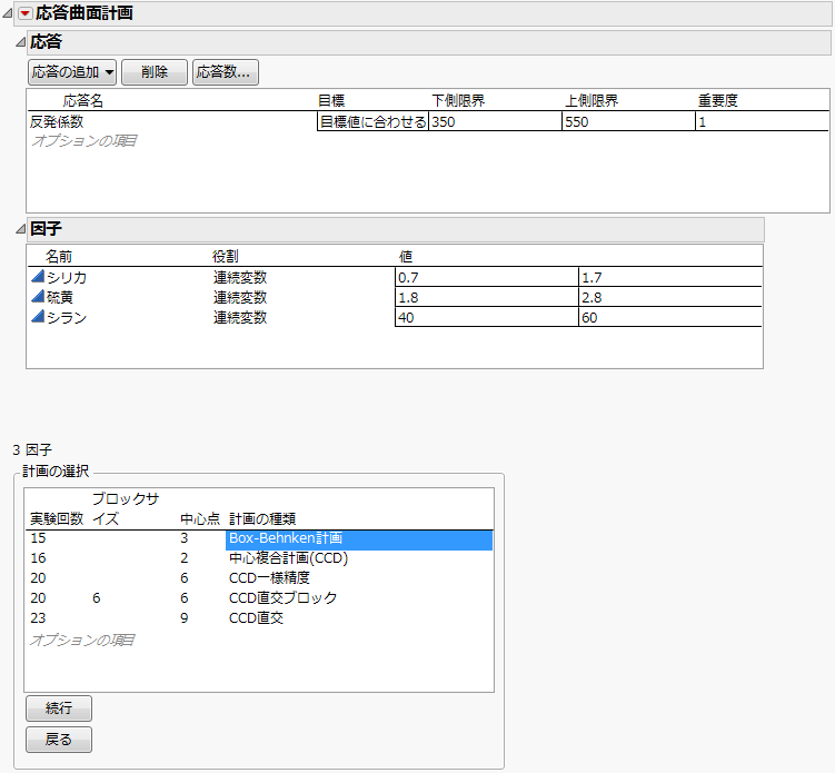 Box-Behnken計画を選択したままの状態で[続行]をクリックします。