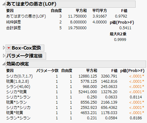 あてはまりの悪さを示唆する証拠は見当たりません。なお、「効果の検定」レポートを見ると、高次の項(シリカ*シランおよびシラン*シラン)を除くすべての項のp値が0.0001以下であることがわかります。「あてはまりの悪さ」および「効果の検定」レポートのテーブルの解釈についての詳細は、『基本的な回帰モデル』の標準最小2乗に関する章を参照してください。
