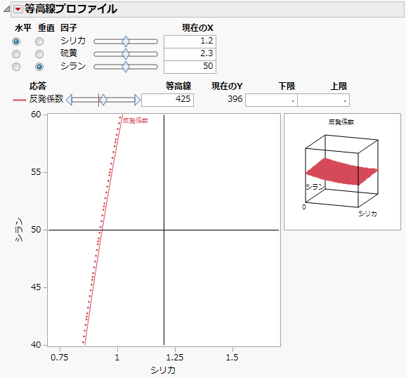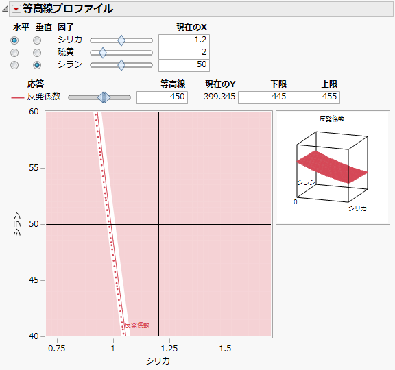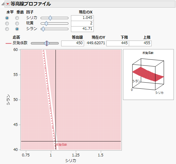 「応答 反発係数」の赤い三角ボタンをクリックし、メニューから[因子プロファイル]>[等高線プロファイル]を選択します。 ここでは「硫黄」の値を「2.0」に固定したうえで、目標値になるような因子設定を探すとします。また、「反発係数」の予測値が450 ± 5に収まるようになるような「シラン」および「シリカ」の因子設定を特定することにします。
