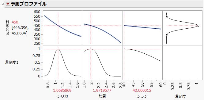 十字線を見ると、「硫黄」= 2.0のとき、「シリカ」= 1.045および「シラン」= 41.71という因子設定であることがわかります。これらの設定は「現在のX」の下に表示されます。この設定のとき、「反発係数」の予測値は449.62071であり、これは「現在のY」の下に表示されます。