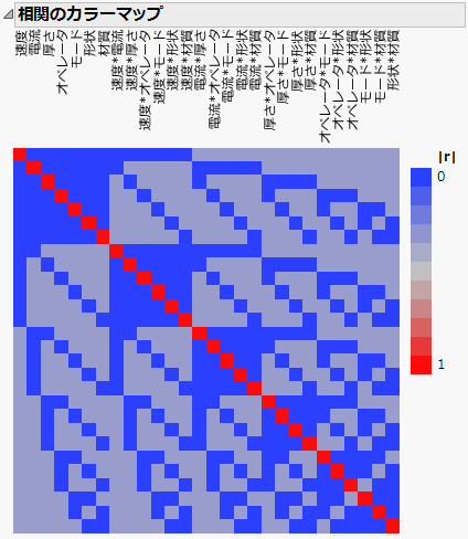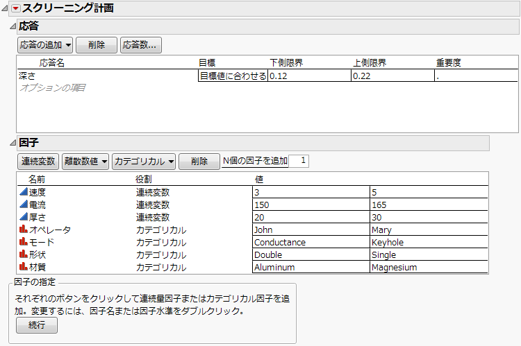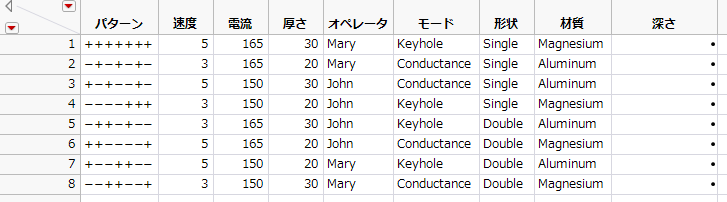 これらの因子のうち、「速度」、「電流」、「厚さ」の3つは連続変数です。「オペレータ」、「モード」、「形状」、「材質」の4つはカテゴリカルな因子です。カテゴリカルな因子にはそれぞれ2つの水準があります。