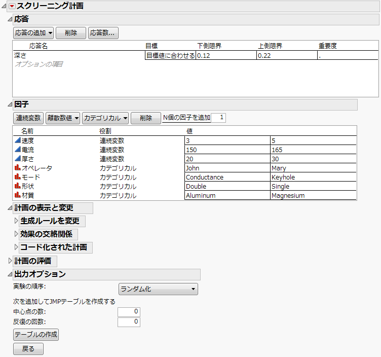 「スクリーニング計画」ウィンドウを開きます。いったん閉じてしまった場合は、計画のデータテーブルの「DOEダイアログ」スクリプトを実行します。