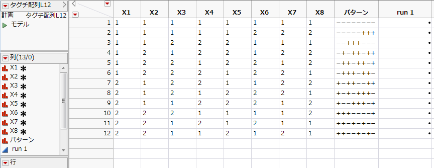 [テーブルの作成]をクリックすると、8因子のL12計画のタグチ計画のようなデータテーブルが表示されます。データテーブルでは、各行が内側配置の1回の実験を表しています。変数「パターン」の値で、プラス(+)記号は高水準、マイナス(-)記号は低水準を示します。データテーブルには、各因子の列や「パターン」列があります。「パターン」列の右側にある列に、実験結果を入力します。なお、「タグチ計画」の赤い三角ボタンのメニューから[応答のシミュレート]を選択した場合、これらの列に乱数が代入されます。