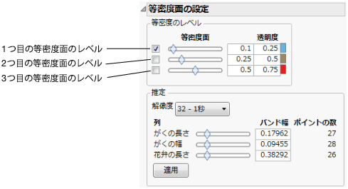 各変数の新しいバンド幅を値で入力するか、スライダをクリックしてドラッグします。[適用]をクリックすると、変更内容が反映されます。