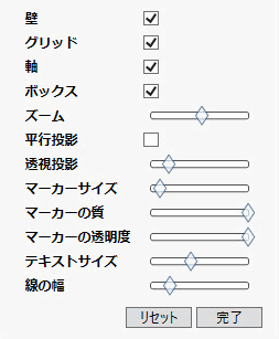 三次元散布図の表示形式のオプションが表示されます。第 “三次元散布図の設定”を参照してください。