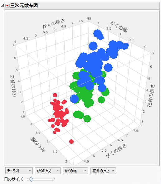 ここでは、「Iris.jmp」データテーブルを使います。このデータテーブルには、3種類のあやめのがくの長さ、がくの幅、花弁の長さ、花弁の幅の測定結果がまとめられています。