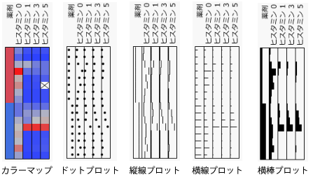連続変数のプロットで使用するカラーテーマをリストから選択することができます。デフォルトのカラーテーマは、[青-> グレー-> 赤](値の低いほうから順に)です。グレースケールのプロットを作成する場合は、[白-> 黒]を使用します。