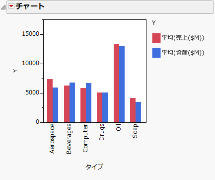 2つの統計量と1つのカテゴリ変数を使ったチャートの棒グラフは、業種(会社のタイプ)間で売上と資産を比較しています。