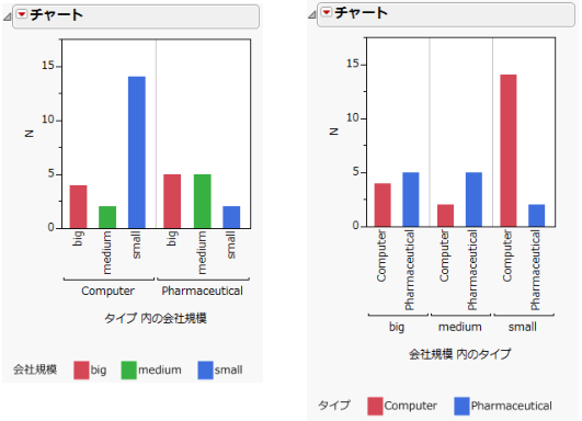 2つのカテゴリ変数を統計量なしでプロットしたチャートの左側の棒グラフは、コンピュータ業界と製薬業界の各業界内における会社規模を示しています。なお、カテゴリ変数として、まず「会社規模」、次に「タイプ」を選択した場合には、右側のような棒グラフになります。