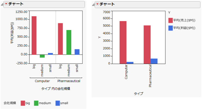 凡例は、必要に応じて表示されます。1~2つのX変数の水準が色またはマーカーで区別されているときは、その対応を示す凡例がチャートの下に表示されます。複数の統計量が色またはマーカーで区別されているときは、その対応を示す凡例がチャートの右に表示されます。