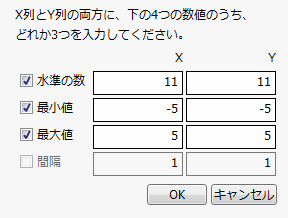 [グリッドの指定]をクリックすると、計算式列で等高線を指定する例のようなウィンドウが表示されます。