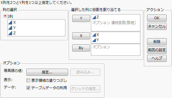 Yの役割を割り当てた列は、等高線を定義する変数として使用されます。1つ以上の列を指定する必要があります。