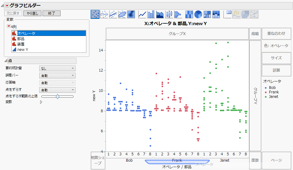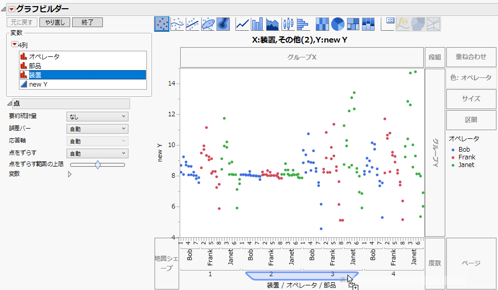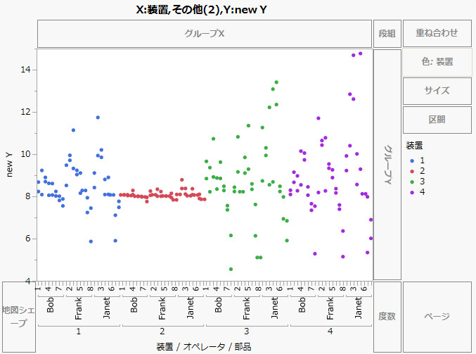 「new Y」の値が、グラフの右側にある凡例を使って「オペレータ」別に色分けされます。これを見ると、ほとんどの部品について、Janetの測定値は他の2人のオペレータの測定値より高い傾向にあるようです。しかし「オペレータ」の効果を視覚的に判断するのは容易ではありません。そこで、別の「オペレータ」軸を作成することにします。